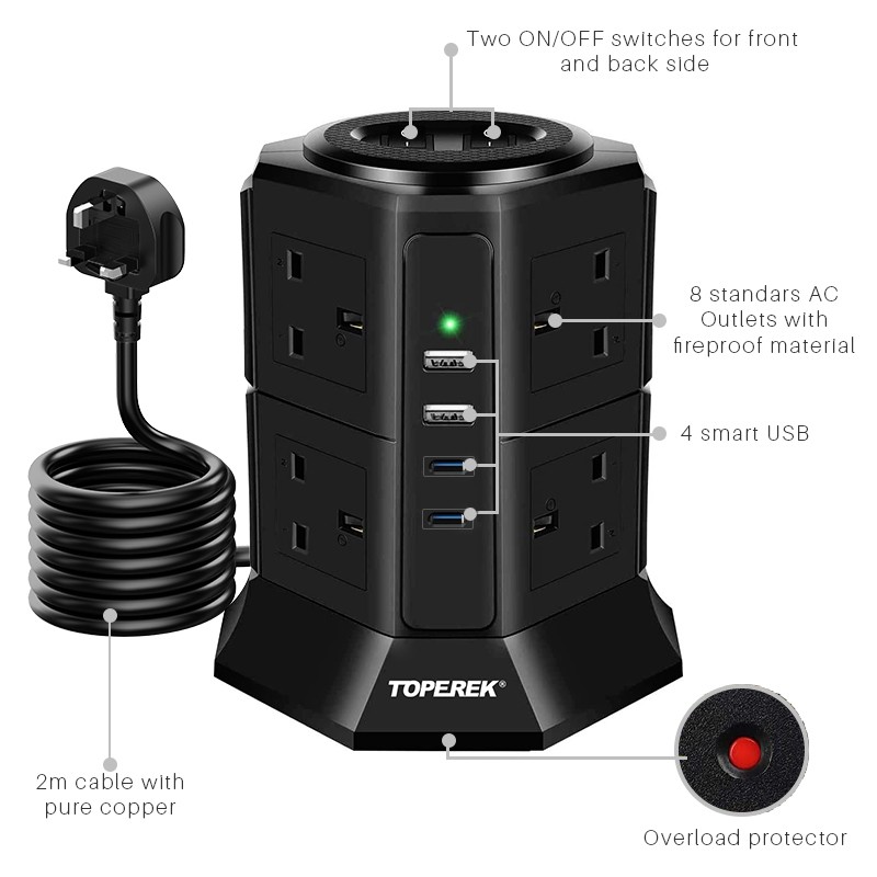 8個(gè)英國插孔 + 2個(gè)USB-A + 2個(gè)USB-C - USB輸出